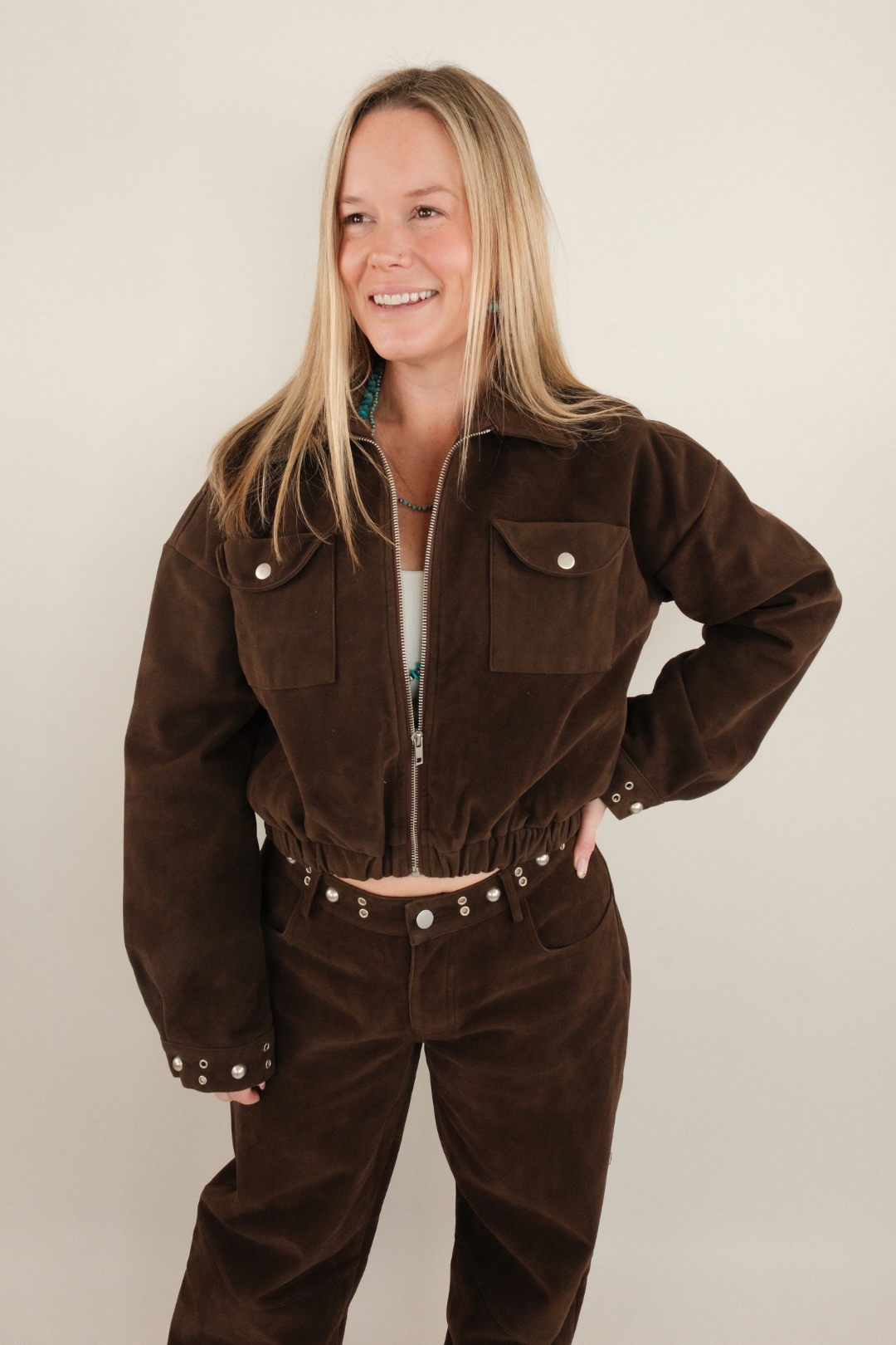 Refined, bold, and undeniably elevated — the Westbound Suede Luxe Set is western luxury at its finest. Crafted in rich dark chocolate suede, this matching set pairs a sleek cropped bomber jacket with tailored straight-leg pants for a look that feels powerful, polished, and timeless. Subtle brushed silver grommet detailing along the pant waistband and jacket cuffs adds a modern edge, while the plush suede finish delivers undeniable sophistication.
