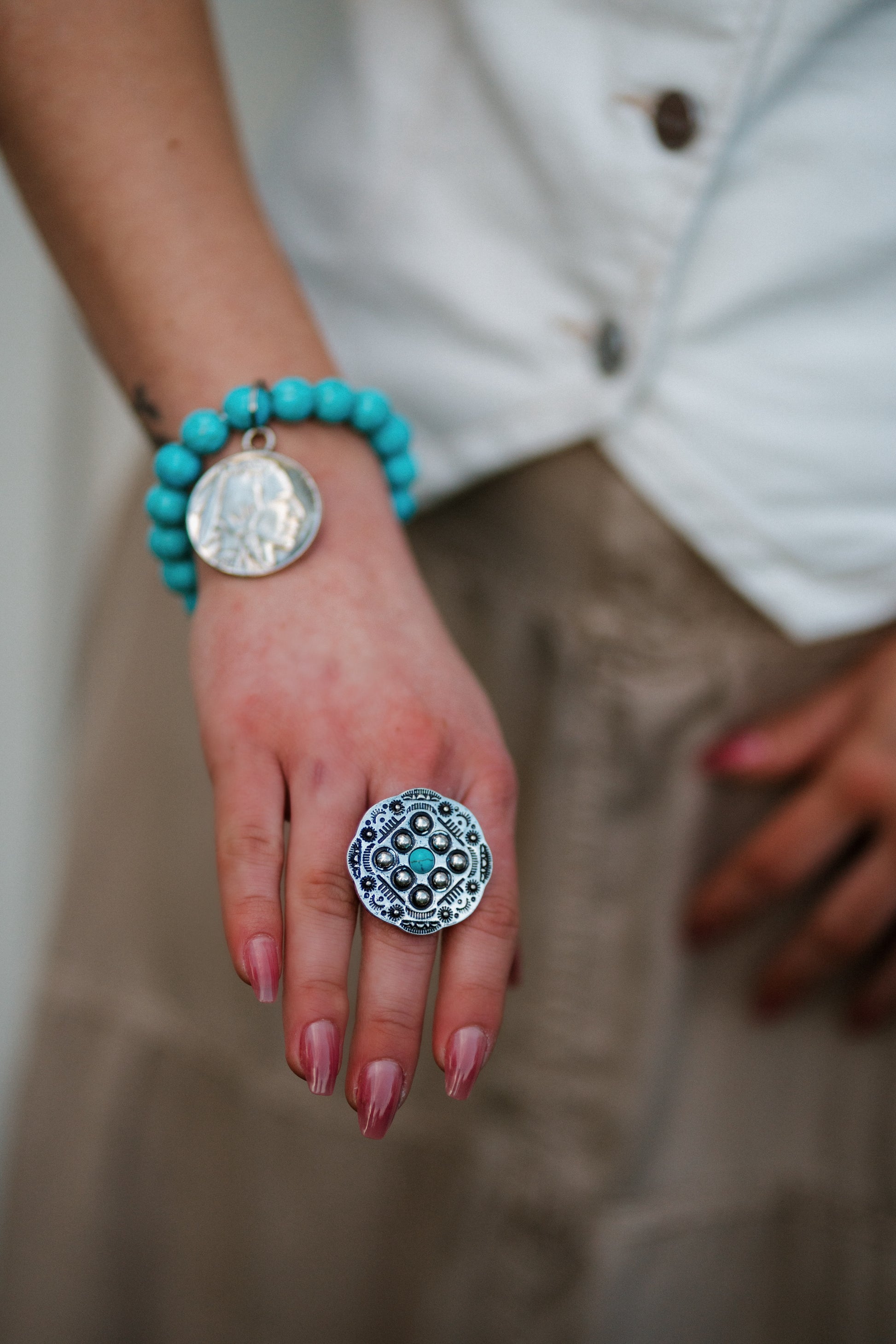 Embrace the bold spirit of the West with this stunning Aztec-inspired stretch ring. The silver band features intricate Aztec designs, beautifully complemented by striking turquoise stones. This unique combination of silver and turquoise creates a timeless, Southwestern look. The stretchy band ensures a comfortable and adjustable fit, making it an easy-to-wear accessory for any occasion.