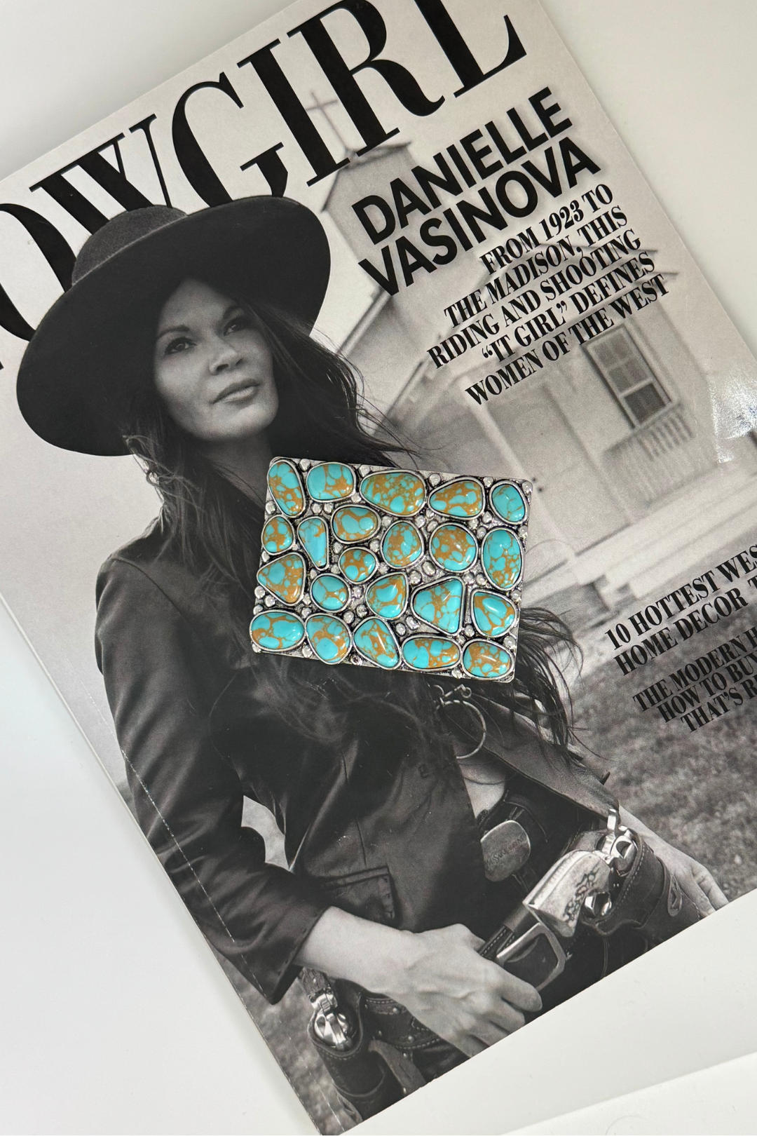 Make a bold statement with the Western Stone Horizon Belt Buckle, a true showstopper for your cowgirl or cowboy look. This oversized rectangular buckle is completely encrusted with small stones cut in a variety of shapes, catching the light with every step. Available in rich turquoise or vibrant green, it’s a striking accessory that pairs beautifully with your favorite denim and boots. Built for those who love to stand out, this buckle blends classic Western charm with a glamorous edge.
