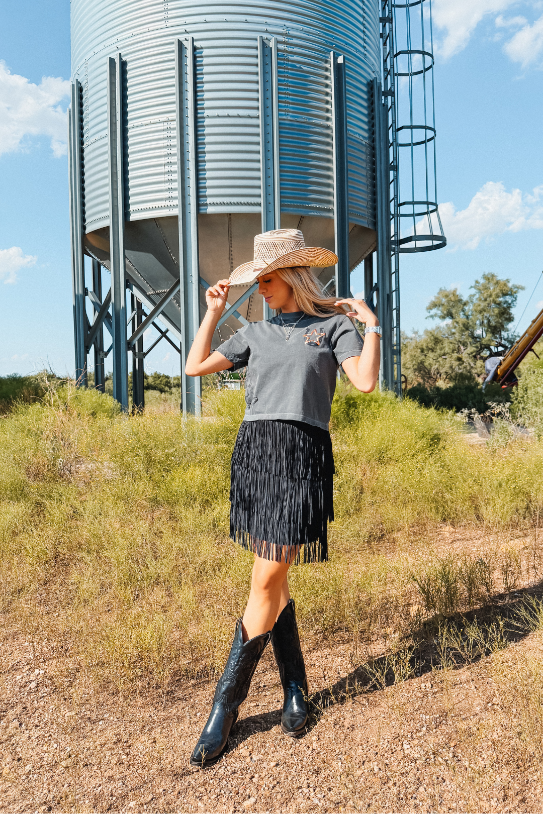 Bring bold movement and desert-inspired charm to your wardrobe with the Wild Dunes Fringe Skirt. This black tiered mini skirt features layers of flowing fringe that sway with every step, giving it a free-spirited western feel. The comfortable elastic waistband ensures an easy fit, while the neutral color makes it a versatile styling piece—from graphic tees and boots to bodysuits and denim vests. Whether you're dancing at a festival or dressing it up for a night out, this fringe skirt adds a touch of cowgirl drama to any outfit.