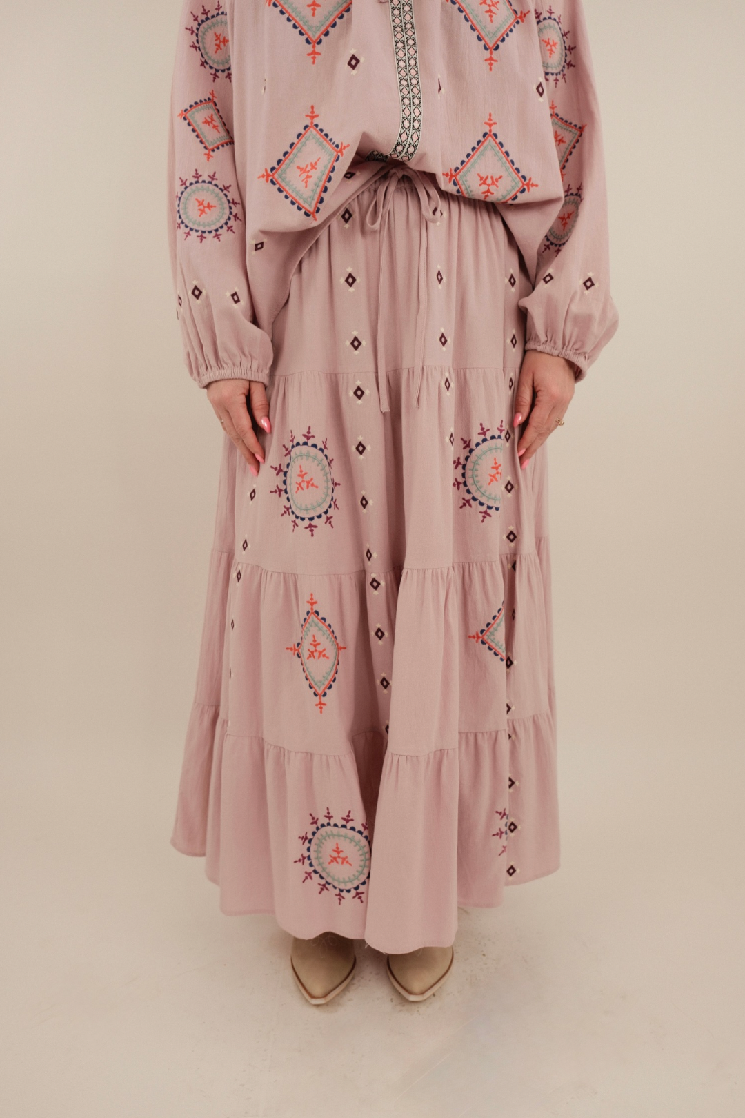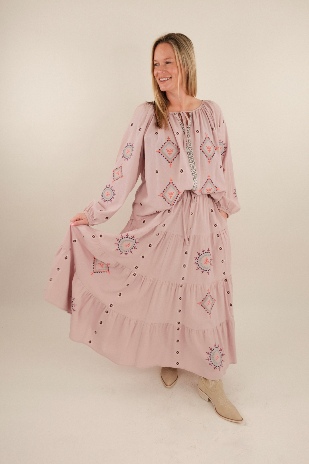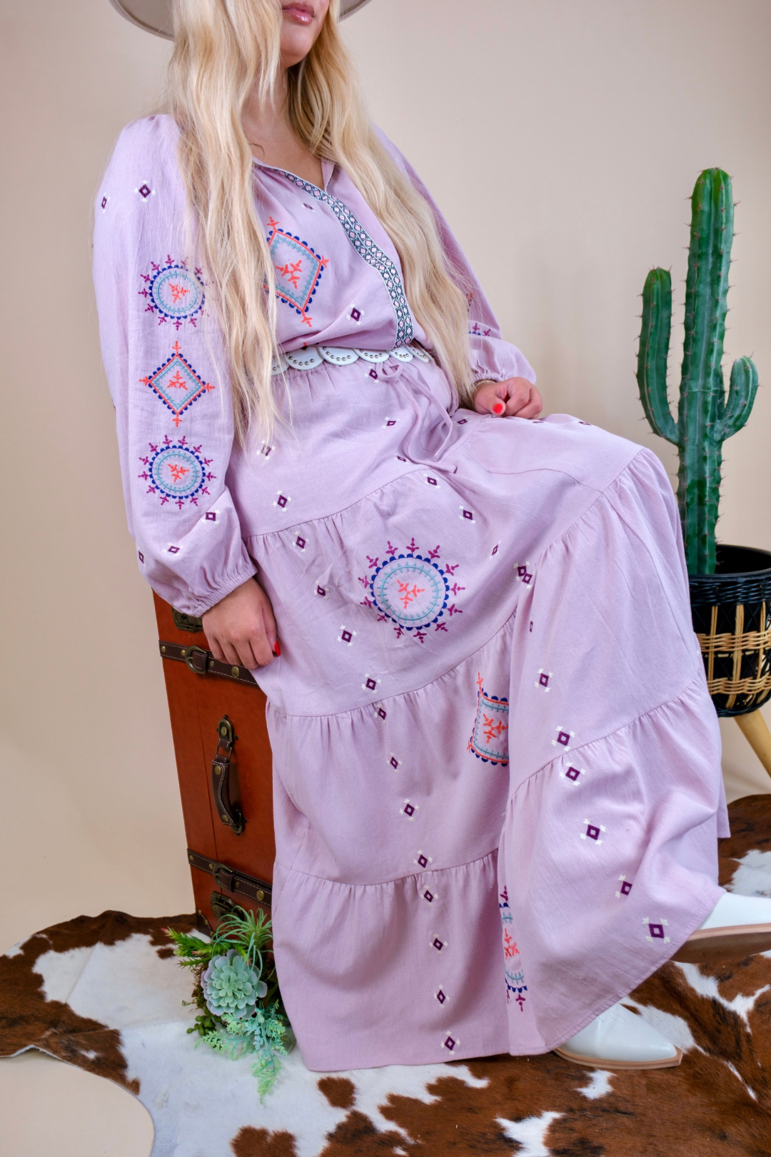 Complete your western-boho look with the Wild Iris Maxi Skirt—a flowing lavender dream designed to pair perfectly with the Wild Iris Boho Blouse. This skirt features a lightweight, breezy silhouette that moves beautifully, while delicate boho embroidery in mint, periwinkle, and coral adds rich texture and color to every tier.