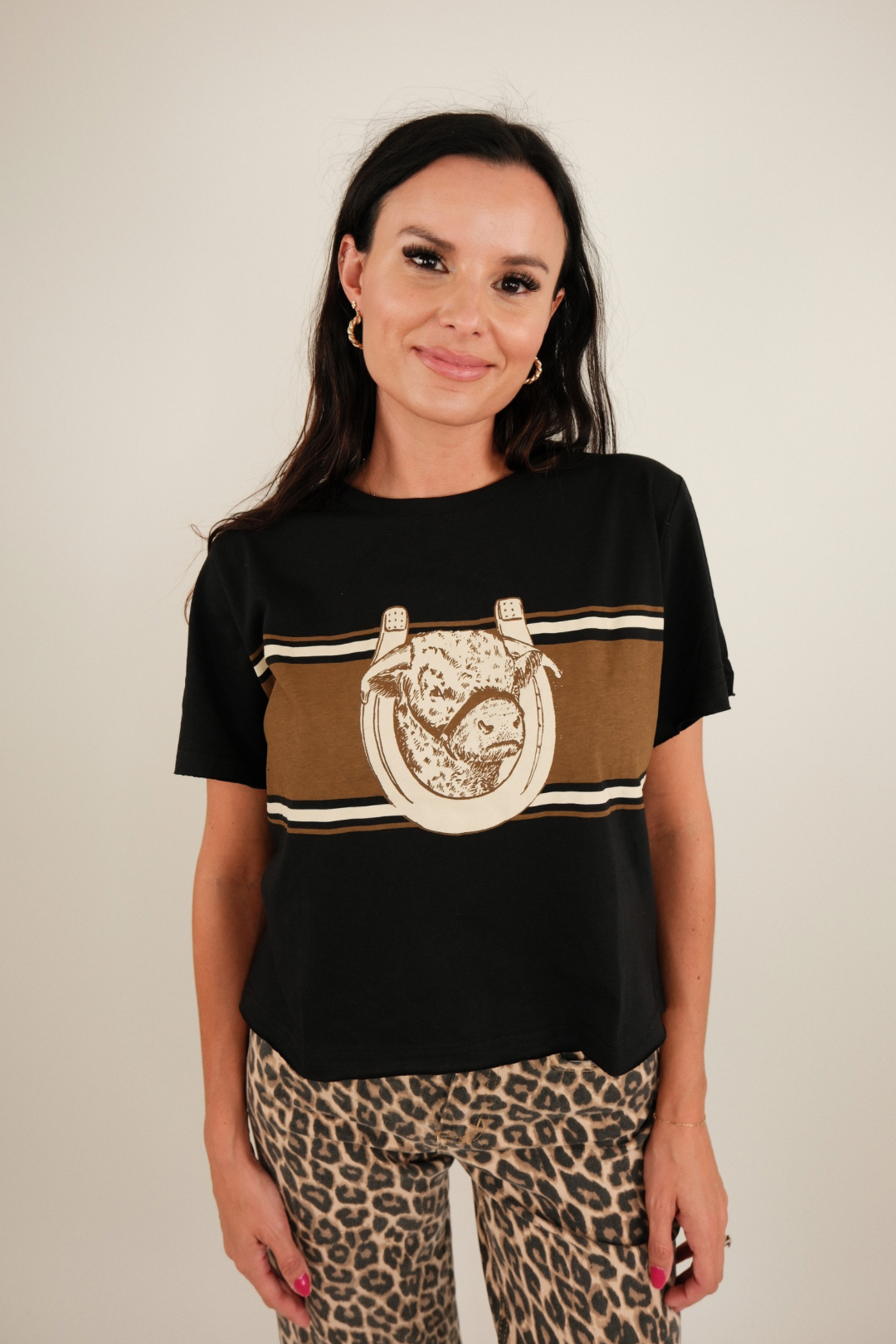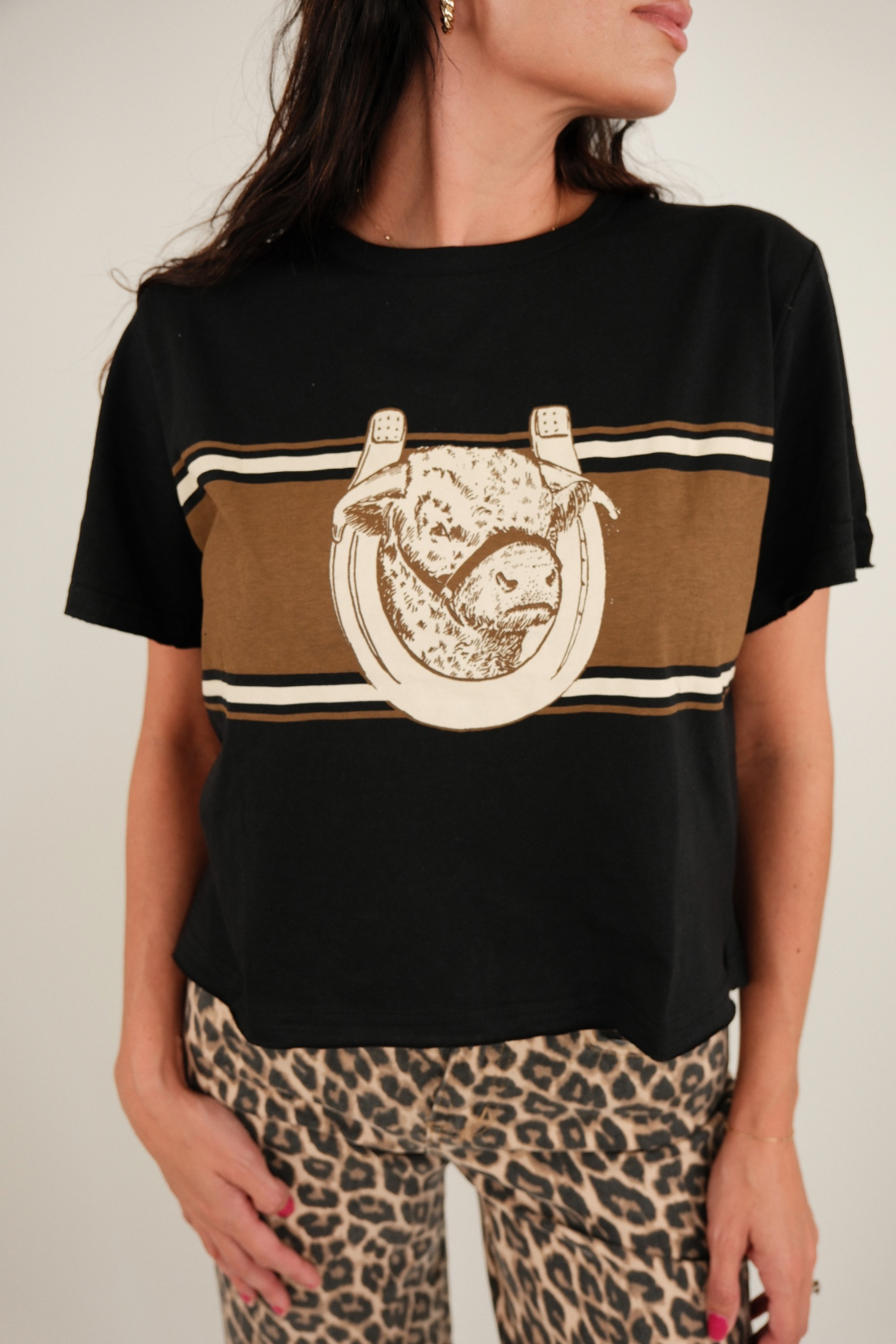 Bring bold western spirit to your everyday wardrobe with the Wild Range Cropped Tee. This black boxy crop features a striking graphic of a bull framed inside a classic horseshoe, layered with horizontal stripes in warm desert tones of tan and beige. With its relaxed fit and cropped cut, this tee is perfect for pairing with high-rise denim, skirts, or even layered under a shacket for rodeo nights.