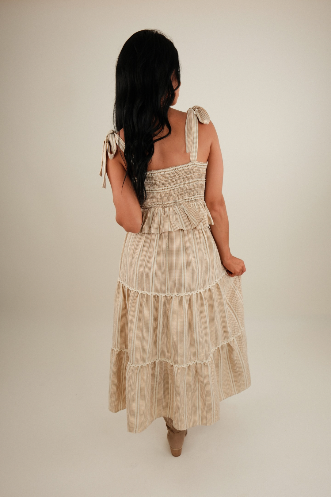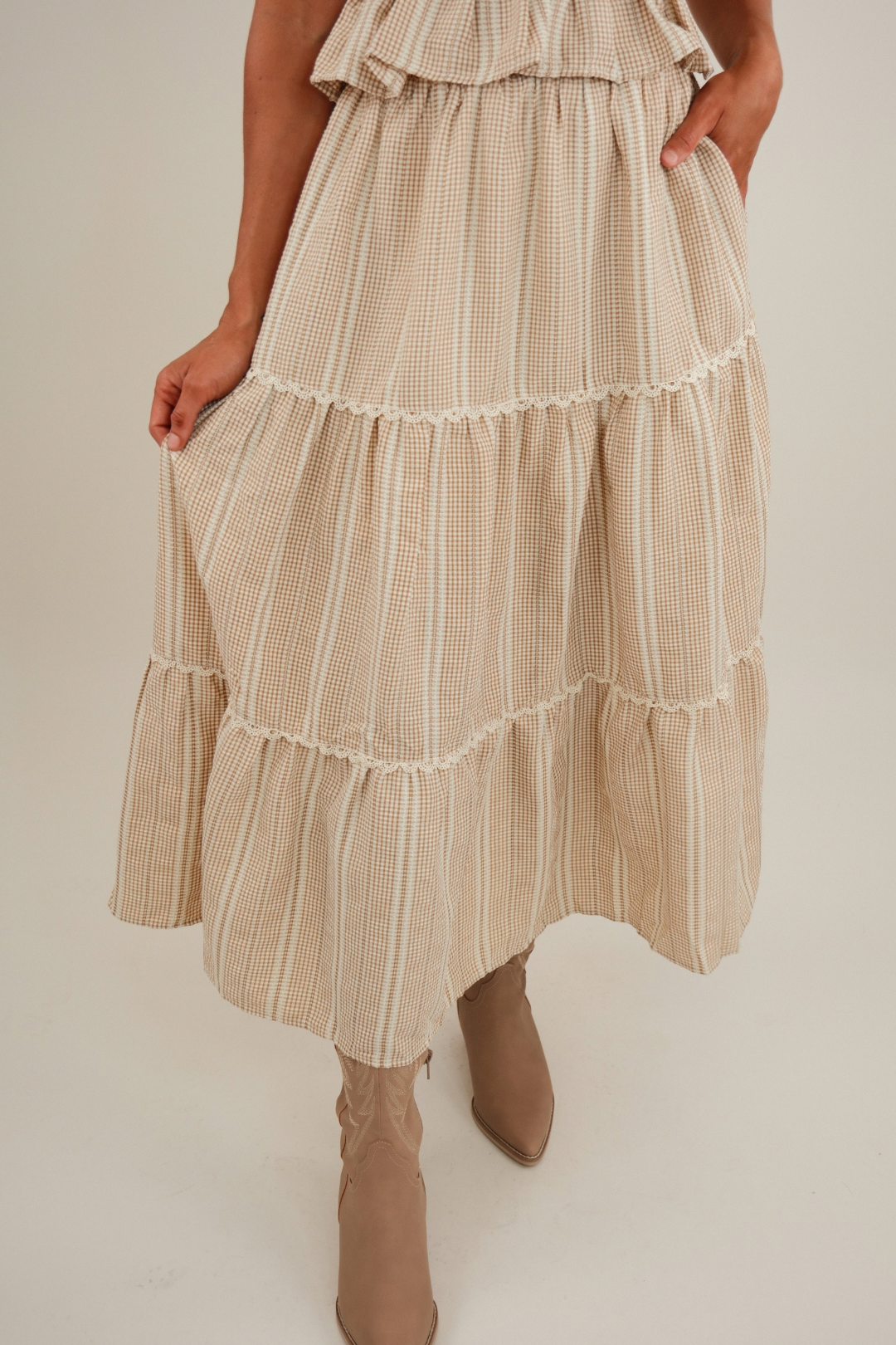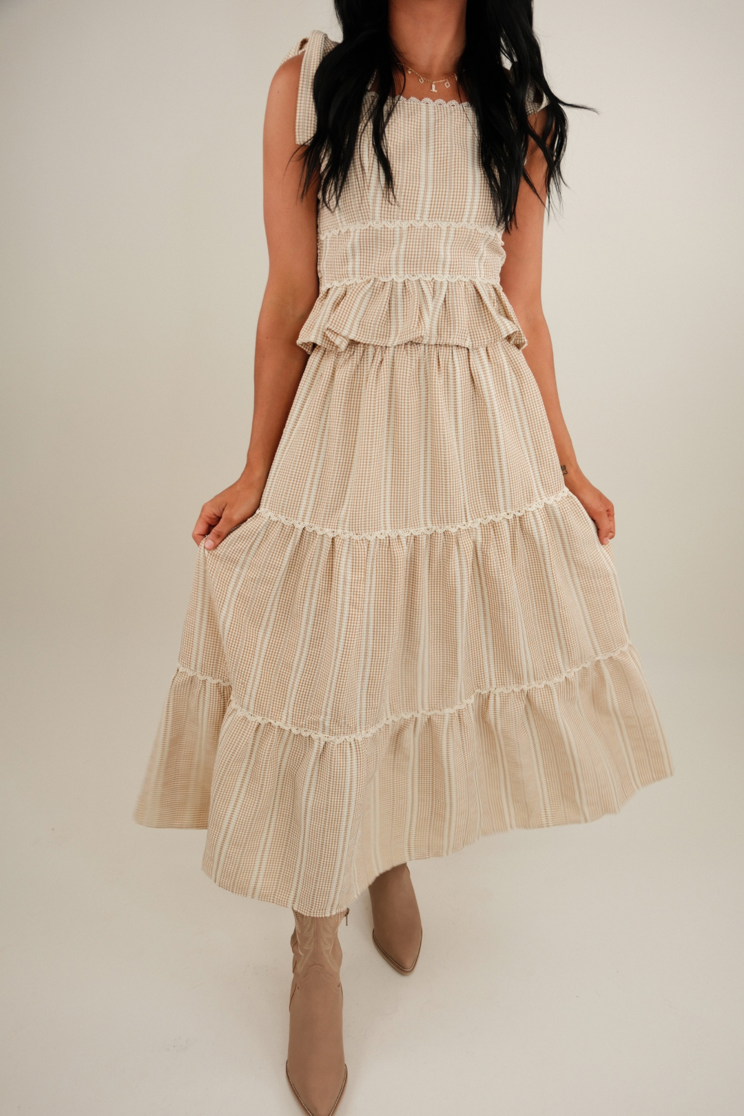 Saddle up in style with the Wild Sage Seersucker Set — a sweet and sassy two-piece perfect for warm desert days and dreamy western nights. This outfit features a cropped tank with adjustable tie straps and tiered detailing, each layer trimmed with delicate lace for a feminine, prairie-chic finish. The coordinating maxi skirt mirrors the top with matching tiers and lace accents, creating a graceful silhouette that flows with every step.