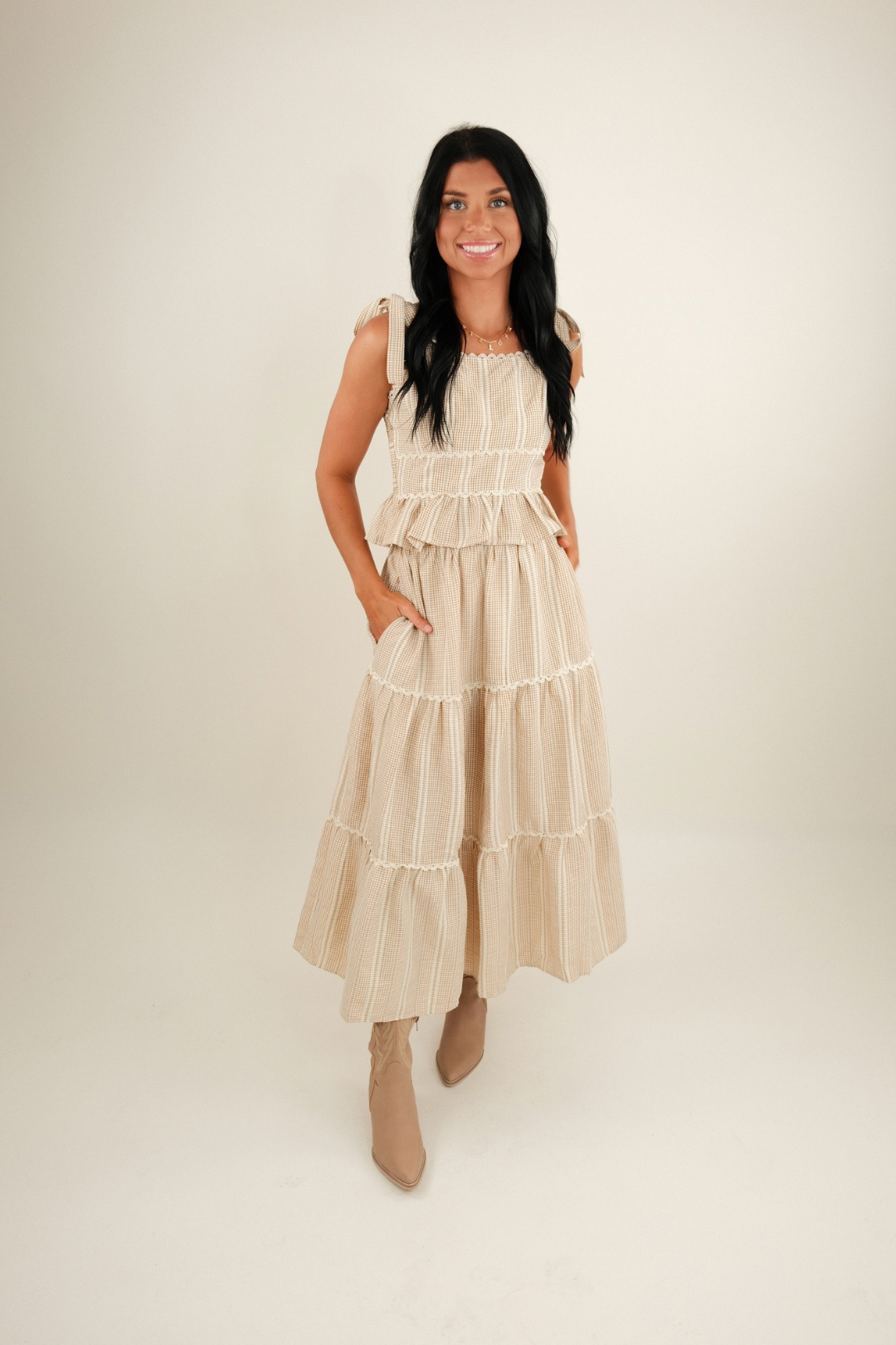 Crafted in a tan and cream seersucker fabric, this set brings breathable comfort and textured charm. Whether you're headed to a country concert, rodeo date night, or brunch at the ranch, this look will have you turning heads.