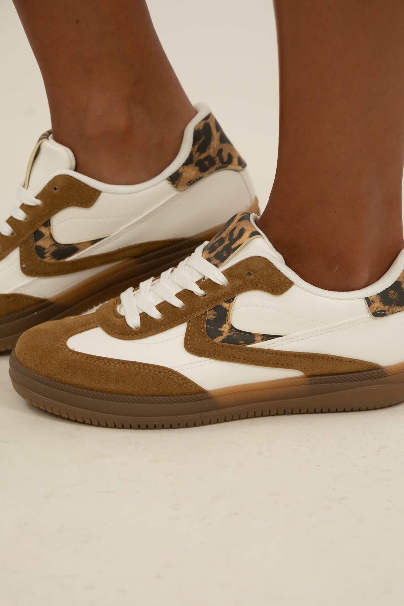 Blaze your own trail in the Wild Trail Kicks, the perfect blend of rugged western flair and modern street style. These low-top sneakers feature rich camel brown tones paired with bold cheetah-print accents for a fierce and fashionable look. Finished with a classic gum sole, they offer unbeatable comfort and grip — whether you're boot-scootin’ downtown or kicking back on the ranch.