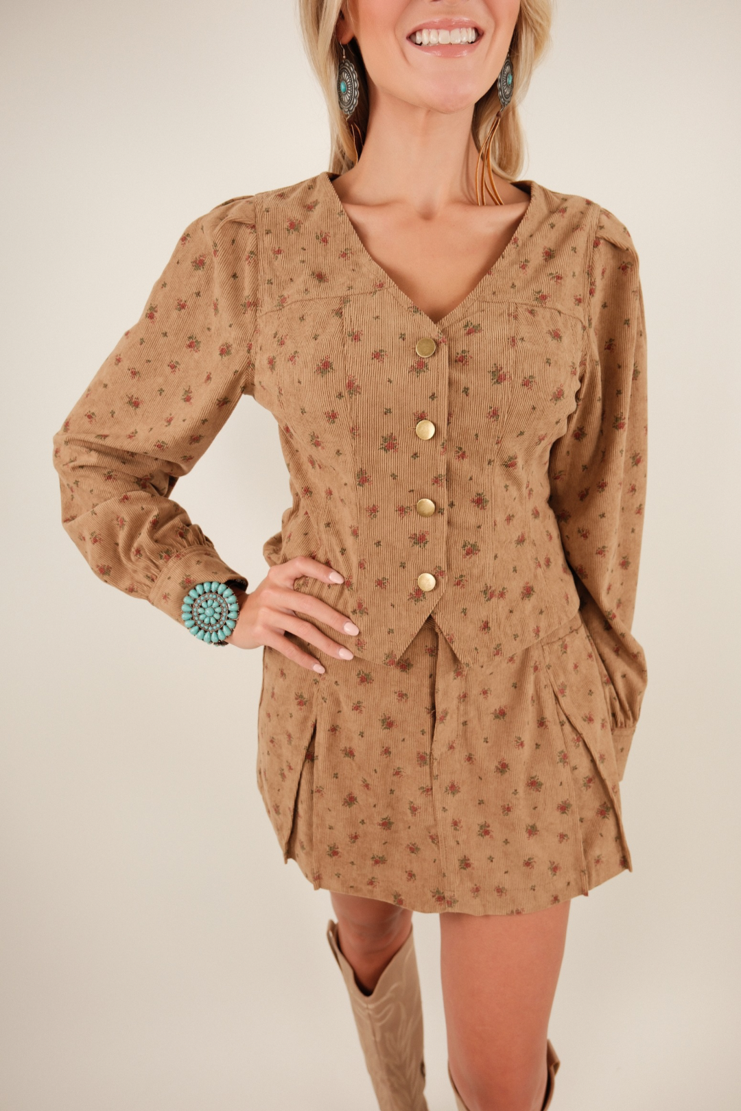 Meet your next statement-making set — the Wildflower Rodeo Corduroy Set. This two-piece combo is a blend of western grit and vintage glam, wrapped in a rich brown corduroy fabric that’s blooming with red and green floral prints. From the rodeo to the rooftop bar, this set is ready to ride.